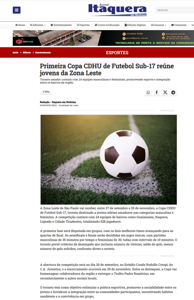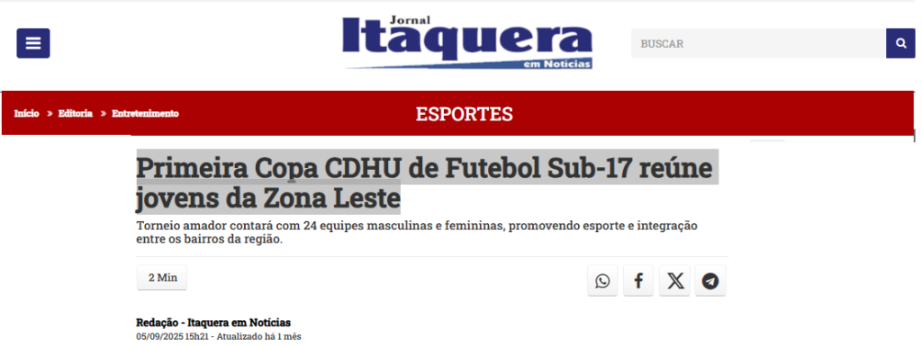 • Jornal Itaquera em Notícias 05/09/2025 – Primeira Copa CDHU de Futebol Sub-17 reúne jovens da Zona Lestesetembro 5, 2025