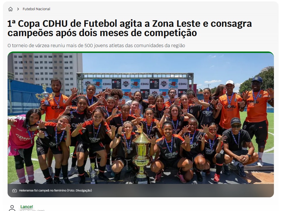 O site Lance! publicou sobre a final da Copa. Veja matéria completa: https://www.lance.com.br/futebol-nacional/1a-copa-cdhu-de-futebol-agita-a-zona-leste-e-consagra-campeoes-apos-dois-meses-de-competicao.html